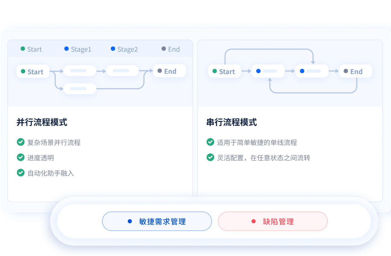 敏捷状态机模式与多分支流程节点模式双工作流引擎,支撑不同规模,不同复杂度项目流程管理。